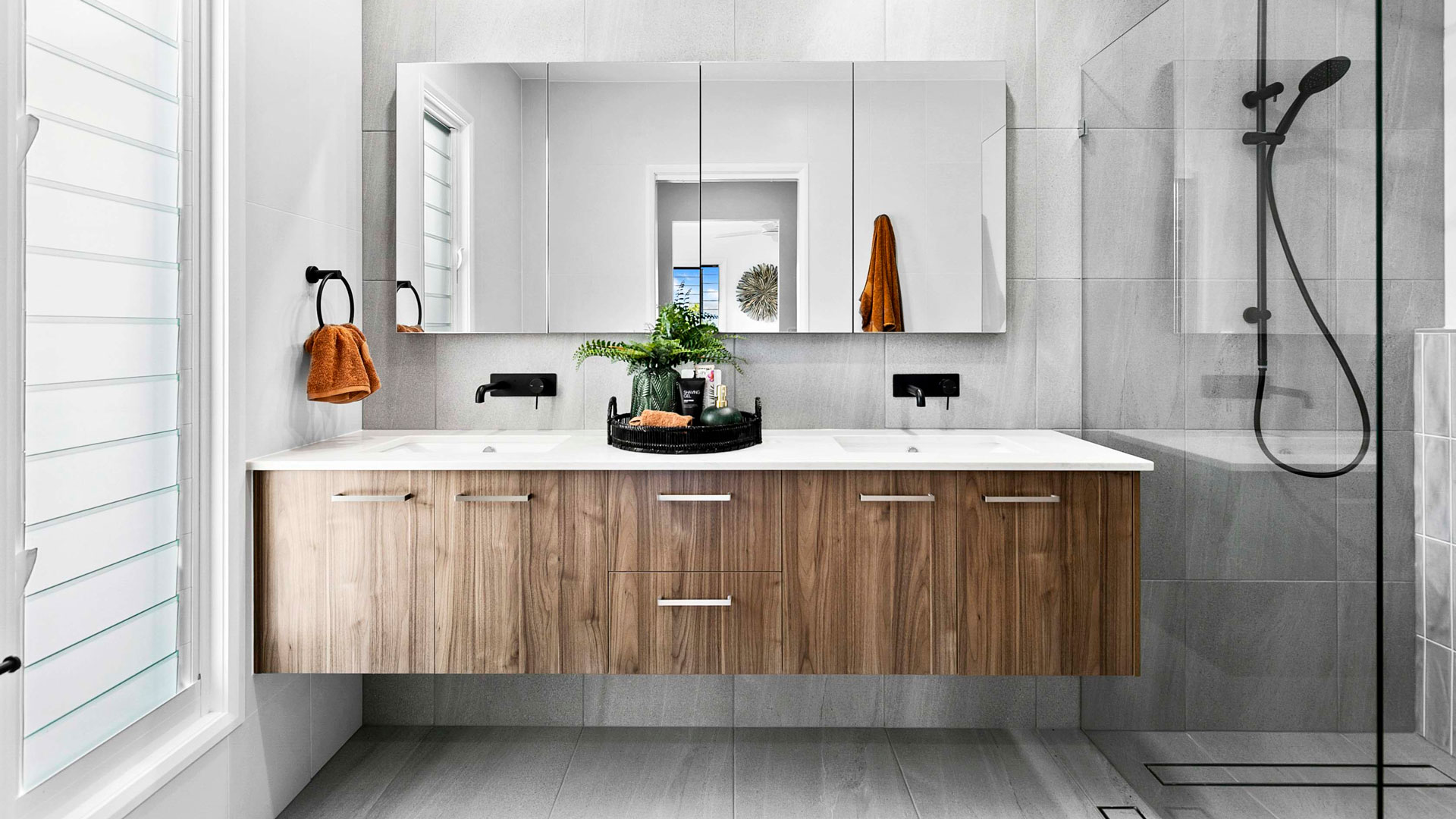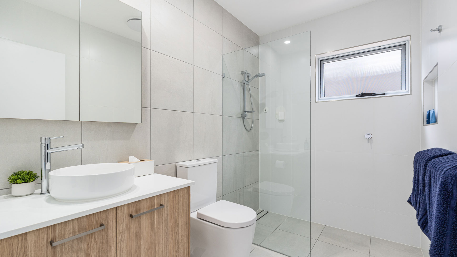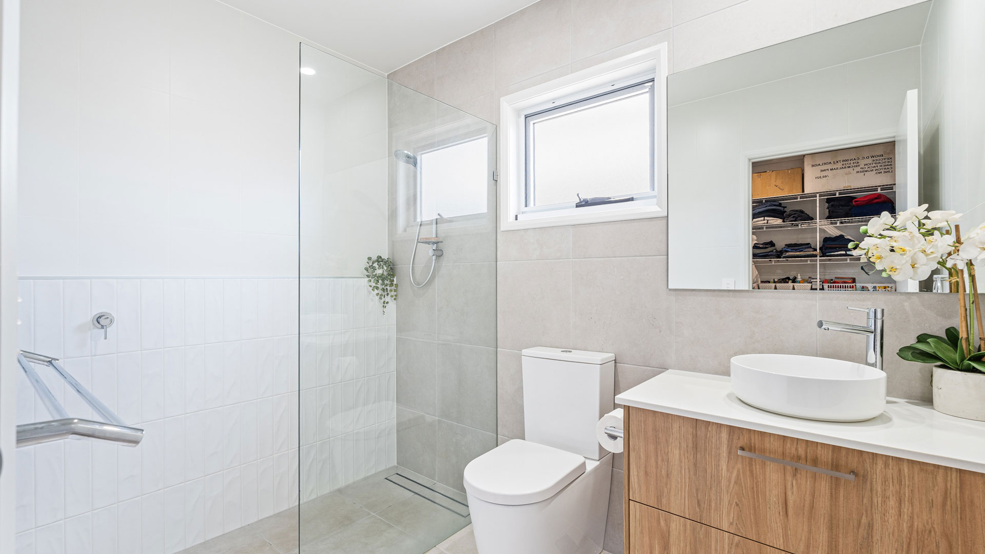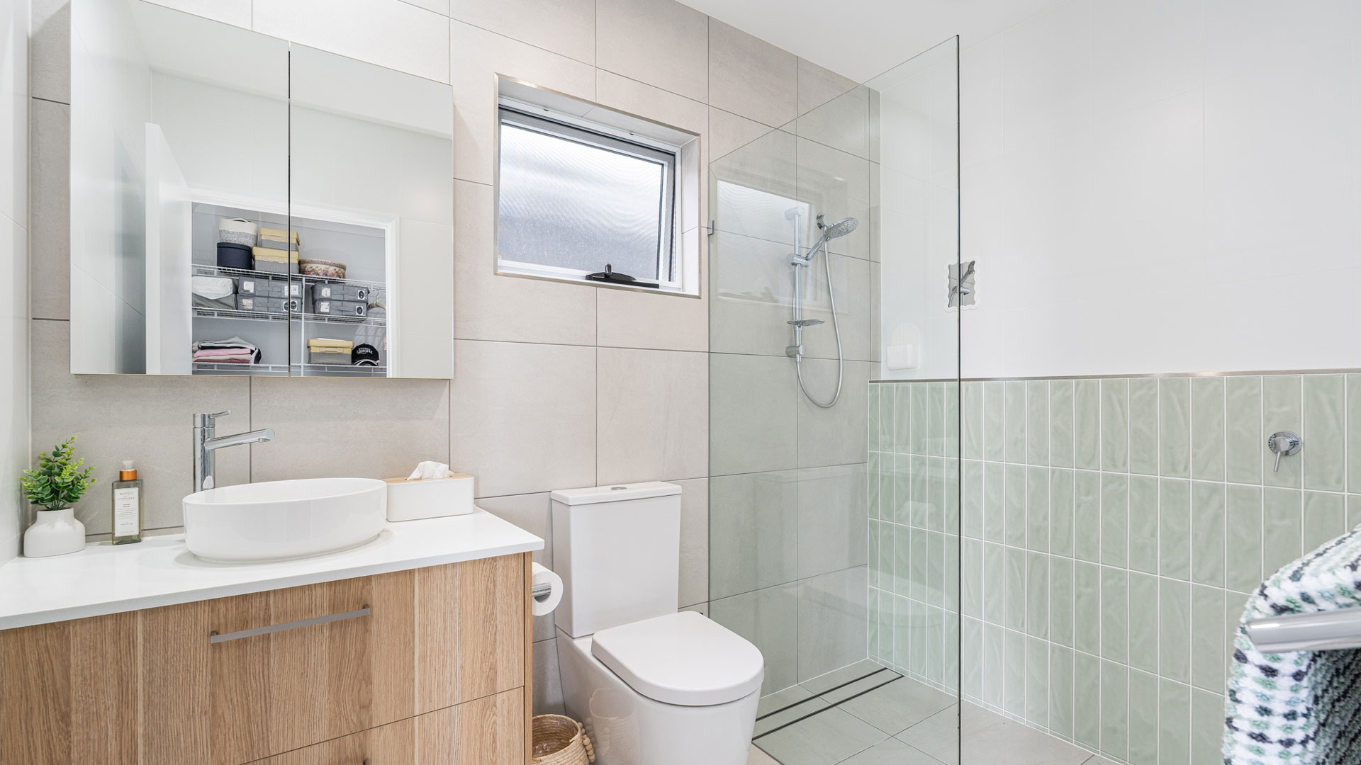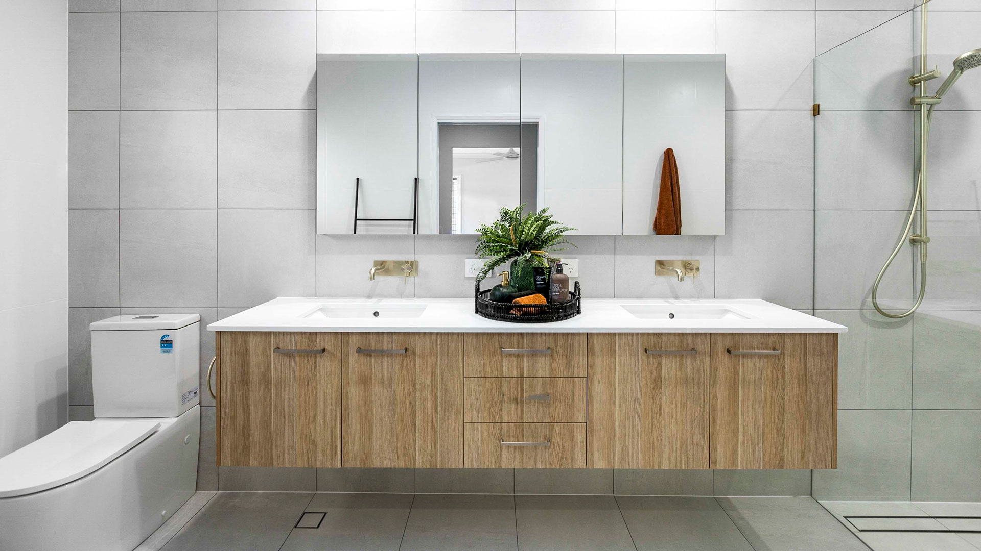 Floor-to-ceiling tiling in bathrooms
